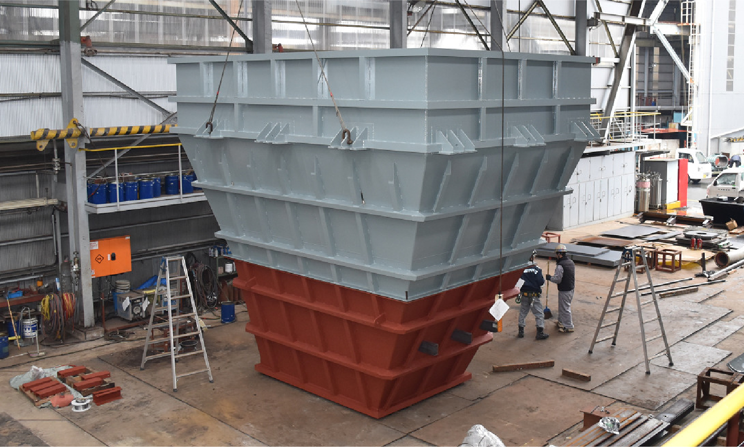 図面を基に鉄工製品や構造物の製作から据付を行う製缶班、プラント設備の設置や分解点検及び摺り合わせ調整をする仕上班で構成しプラントの増改築や保全一式を担います。